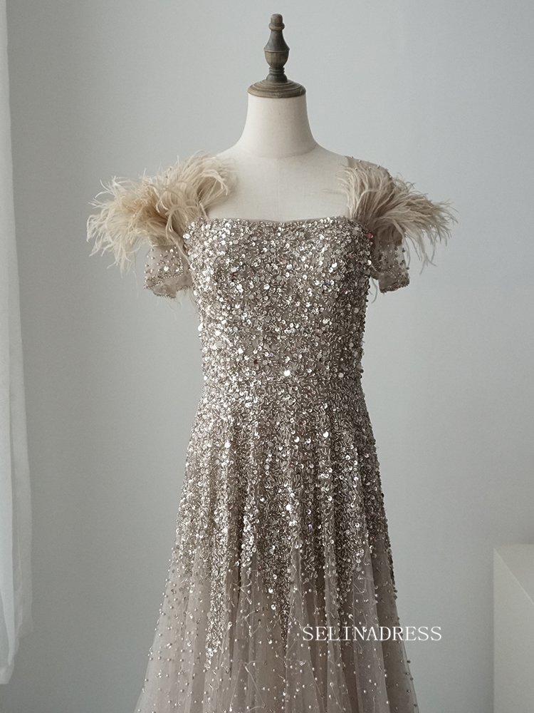 Chic Aline Sequins Feather Long Prom Dress Elegant Evening Dress KOP